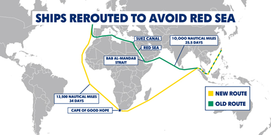 - Delivery delays: Rerouting vessels from the Red Sea around the Cape of Good Hope has added two weeks to shipping schedules.